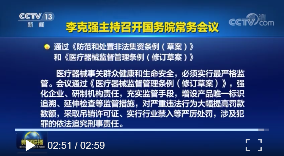 医疗器械事关人民群众身体健康和生命安全,必须实行最严格的监管。12月21日主持召开国务院常务会议,会议通过《医疗器械监督管理条例(修订草案)》。会议指出,要强化企业、研制机构对医疗器械安全性有效性的责任,明确审批、备案程序,充实监管手段,增设产品唯一标识追…