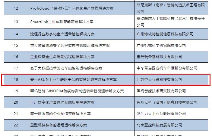 8月10日,工信部公布了支撑疫情防控和复工复产工业互联网平台解决方案名单,全国共计66家企业入选。其中,中天互联基于ASUN工业互联网平台的智慧能源管理解决方案(恢复制造企业产能方向)成功上榜!以下是部分入围名单:据了解,本次征集以解决新冠疫情发生以来工业企业…