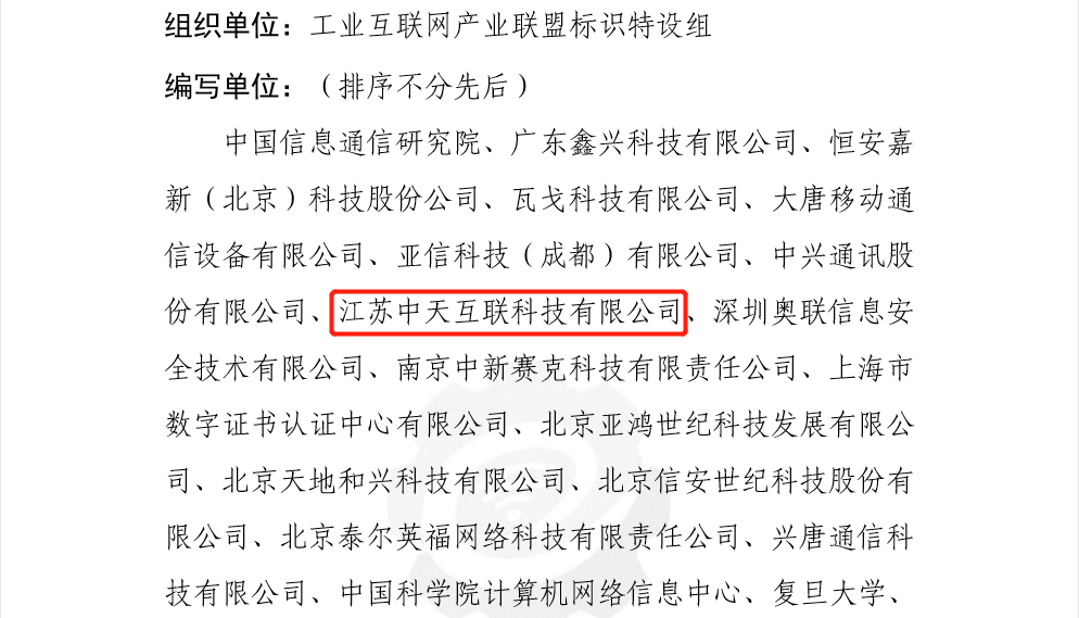 2019年,工业和信息化部等十部委联合印发《关于加强工业互联网安全工作的指导意见》,其中特别就工业互联网标识解析体系安全工作推进进行了重点部署,要求标识解析系统的建设运营单位同步加强安全防护技术能力建设,确保标识解析系统的安全运行。江苏中天互联科技有限公司…